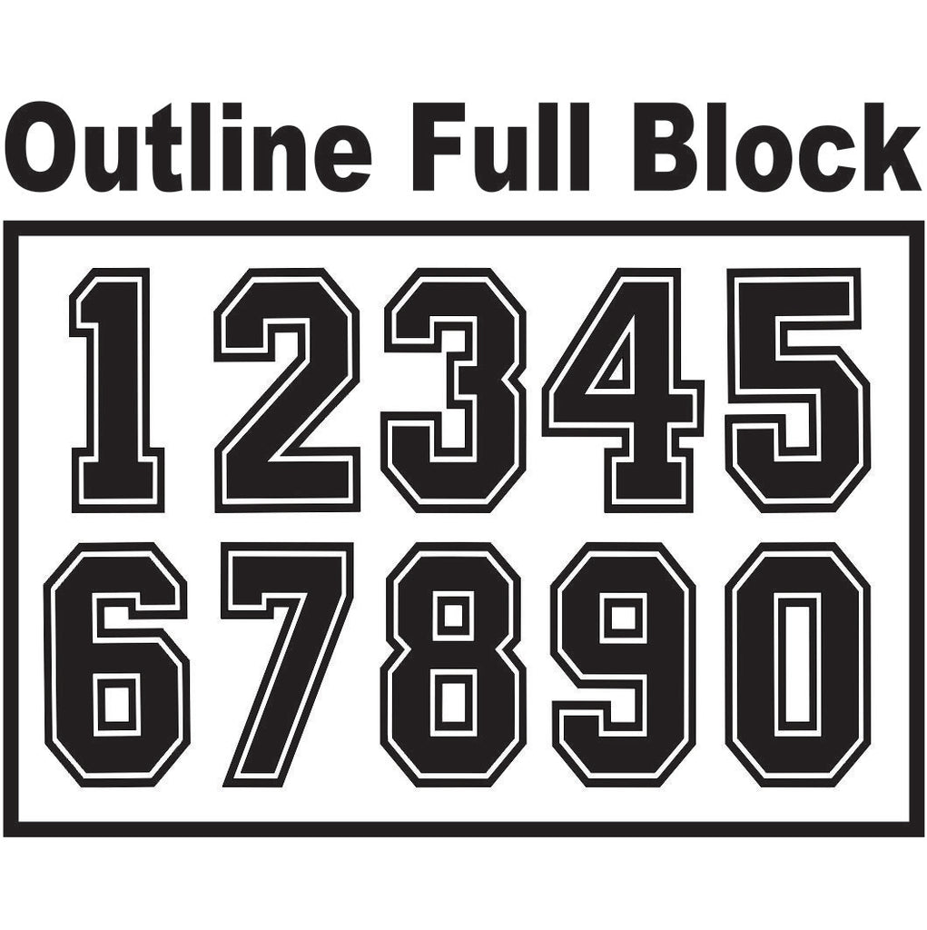 We can offer you a choice of five different styled numbers: Full Block,Nouveau,Football Style,Outlined Block and Outlined Nouveau numbers. These numbers are also available in various other set sizes: 10cm numbers sets,15cm number sets,20cm number sets